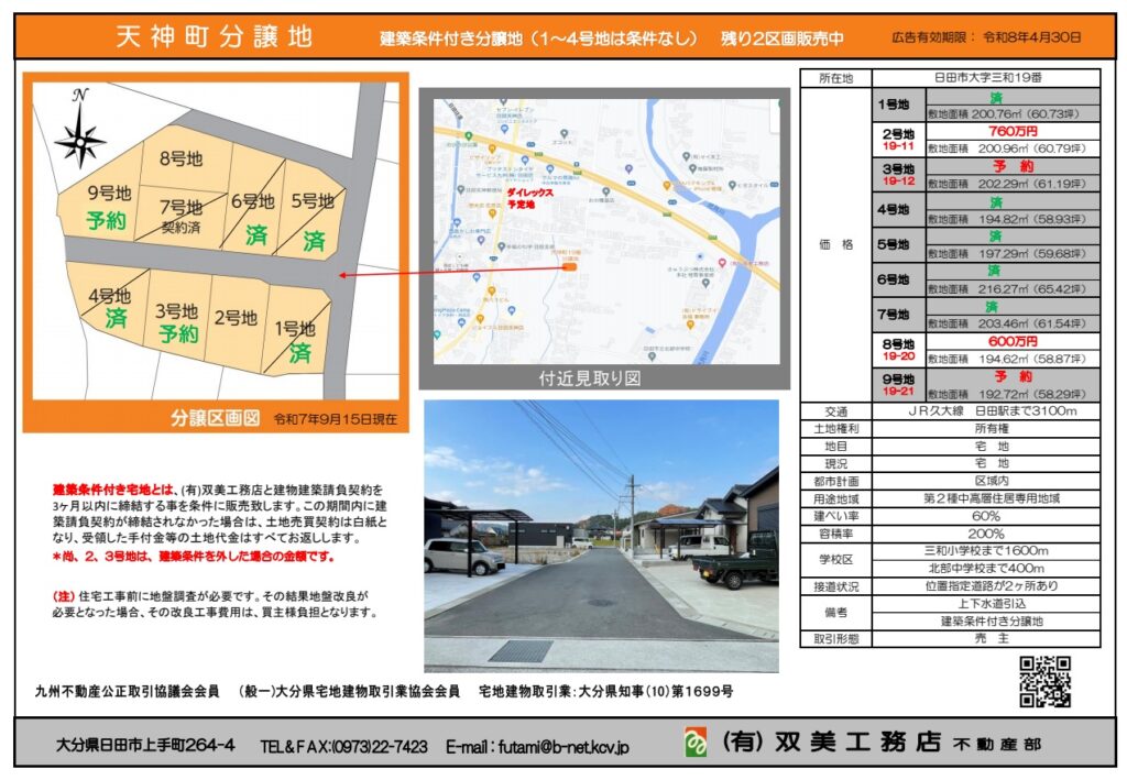 タグ日田市、分譲地 日田市、新築住宅、天神町分譲地 三和地区 一部建築条件外した分譲地、被災害地